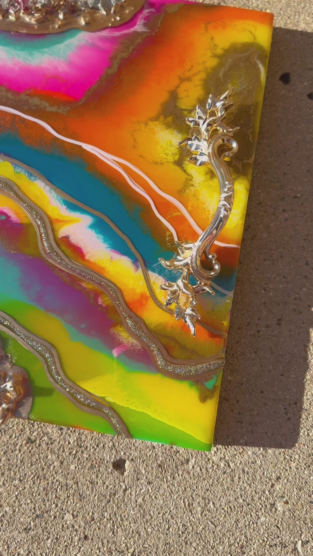 Adorned with vibrant crystals and bright colors, this 12x16 tray is the ideal addition to elevate your home decor. Its whimsical handles add a touch of glamour to the design, making it a unique and stylish piece for any room.