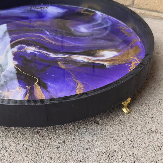 The Intertwined in Chaos tray measures 15.75 inches and features a marbled design in deep purple violet, black, white, and gold. Engraved with gold lettering inspired by Prince, it combines elegance with versatility. The tray is supported by luxurious gold feet, enhancing its aesthetic appeal while providing stability for various uses.